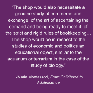A cornerstone of the Montessori Middle School curriculum is the Micro Economy—a practical, hands-on way for students in 7th and 8th grades to explore production, exchange, and the social life of work. True to Maria Montessori’s vision, it provides an authentic environment for adolescents to experience responsibility, collaboration, and entrepreneurship.